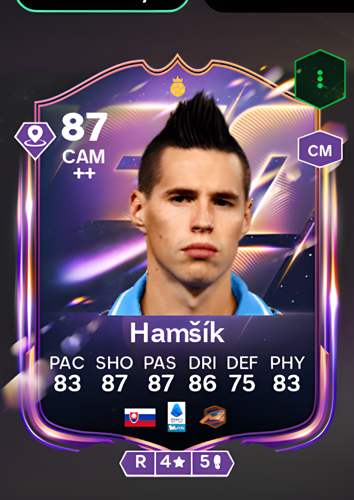 Marek Hamšík's Heroes card showcases him as a Central Attacking Midfielder with an impressive overall rating of 87, highlighting his all-around abilities on the pitch. Boasting 83 pace, 87 shooting, 87 passing, and 86 dribbling, Hamšík offers a dynamic presence in the midfield, capable of orchestrating attacks and finishing chances with equal finesse. His 75 defense and 83 physicality further enhance his versatility, allowing him to contribute both offensively and defensively. As a CAM, this card stands out for its ability to control the tempo, deliver incisive passes, and make late runs into the box, making Hamšík a pivotal figure for breaking down defenses and creating goal-scoring opportunities.