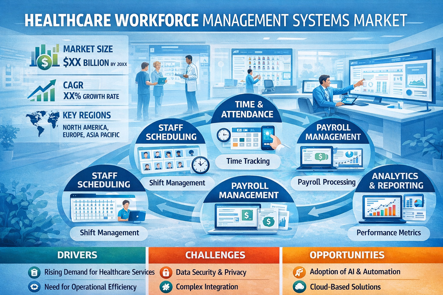 The market is evolving rapidly as healthcare organizations shift toward data-driven decision-making and automation. Workforce management systems enable real-time visibility into staffing needs, allowing healthcare providers to optimize workforce utilization, reduce operational inefficiencies, and enhance patient outcomes.
