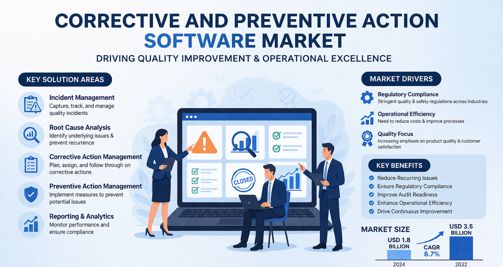 The Corrective and Preventive Action (CAPA) Software Market Growth is witnessing significant expansion as organizations across regulated industries increasingly adopt digital quality management solutions to improve compliance, operational efficiency, and risk mitigation. CAPA software helps businesses identify non-conformities, track root causes, and implement preventive measures to avoid recurring operational issues. Industries such as manufacturing, healthcare, construction, and government are leveraging CAPA solutions to streamline quality management processes and maintain regulatory compliance. According to market research insights, the market is projected to experience steady growth during the forecast period 2025–2031, driven by rising demand for automated compliance systems and improved workflow management solutions.