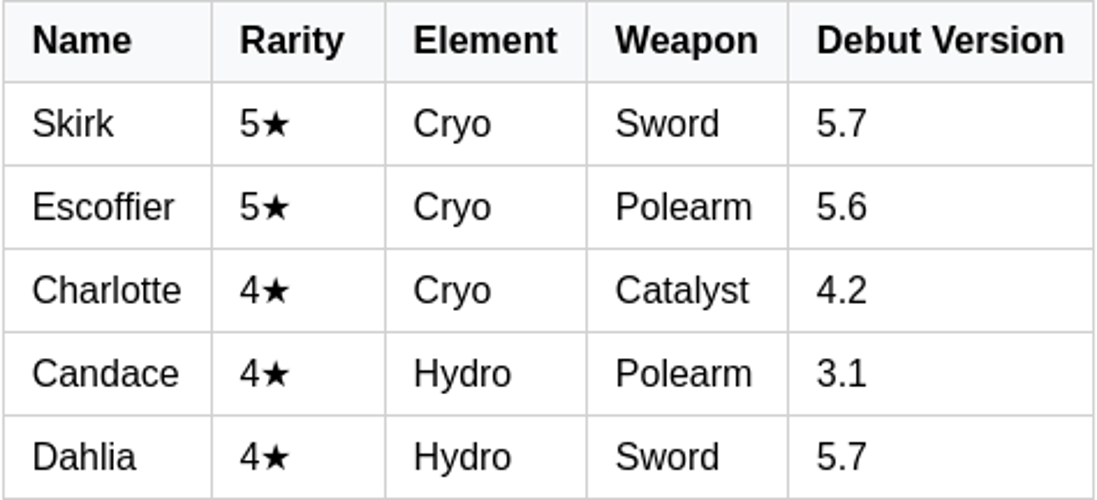 Skirk, the piercing swordmaster, and Escoffier, the elegant polearm user,