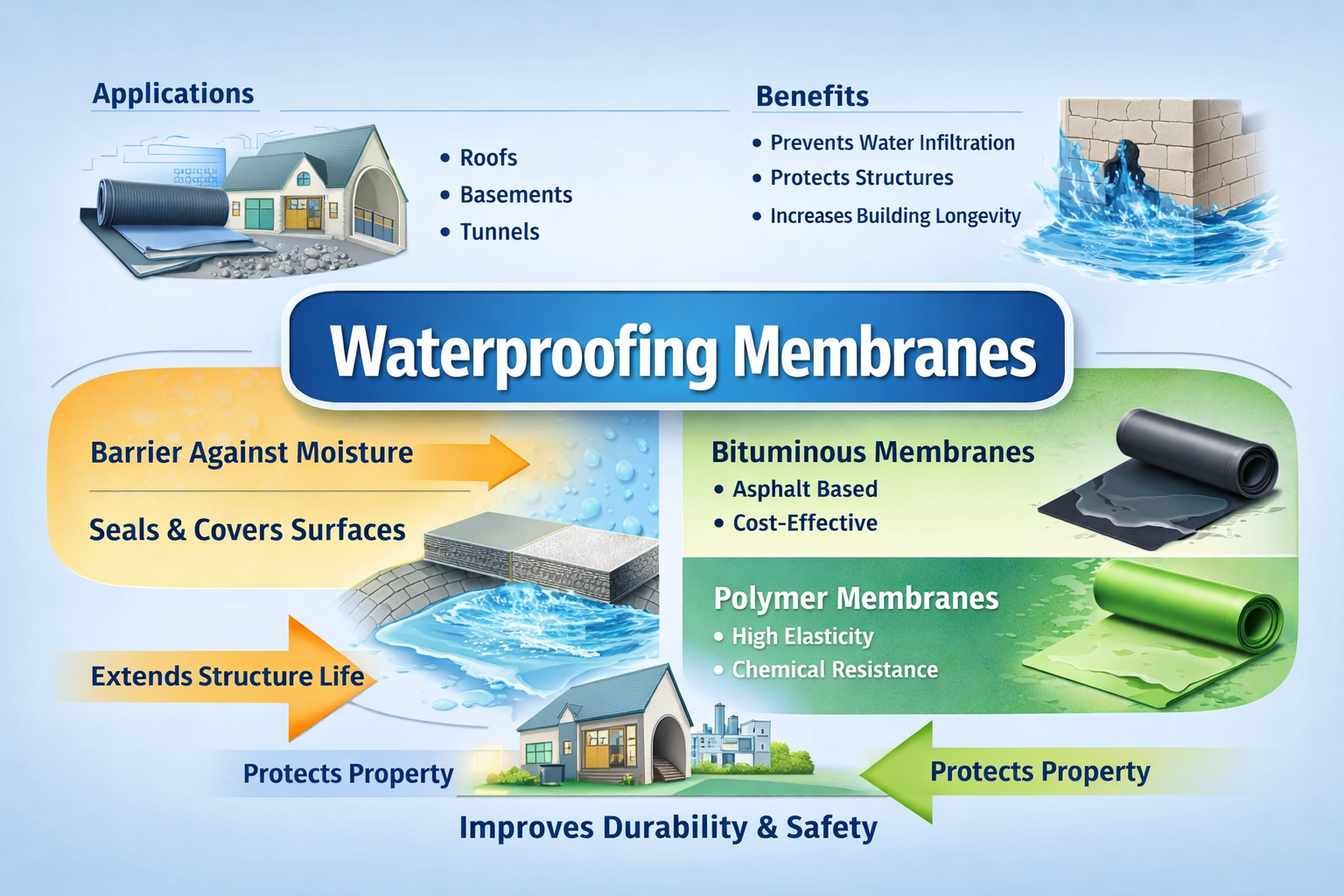 Sheet membranes are widely adopted because of their uniform thickness, ease of installation, and consistent performance. Liquid-applied membranes are favored for irregular surfaces, refurbishment projects, and intricate structures. Key applications include roofing, basements, terraces, tunnels, bridges, and industrial facilities.