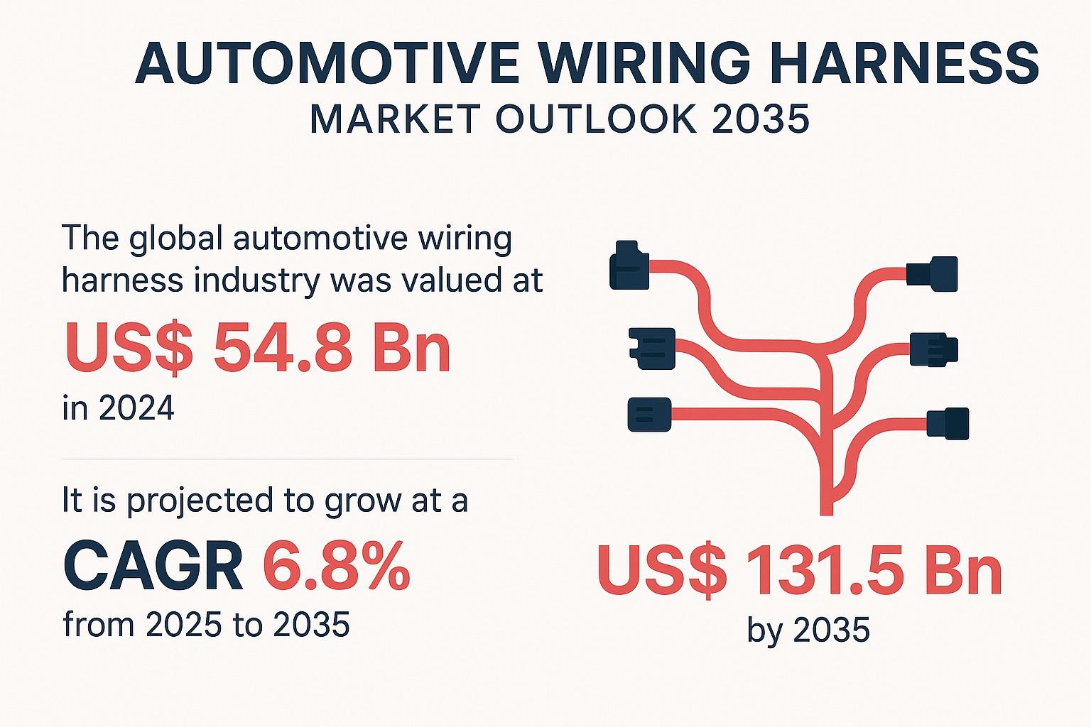 In today’s rapidly transforming automotive industry, the automotive wiring harness acts as the central nervous system of vehicles—carrying signals, power, and information across every major system. As vehicle technology advances, so does the complexity and demand for sophisticated wiring systems. According to the latest market outlook, the global automotive wiring harness market was valued at US$ 54.8 billion in 2024 and is projected to reach US$ 131.5 billion by 2035, growing at a CAGR of 6.8% from 2025 to 2035.
