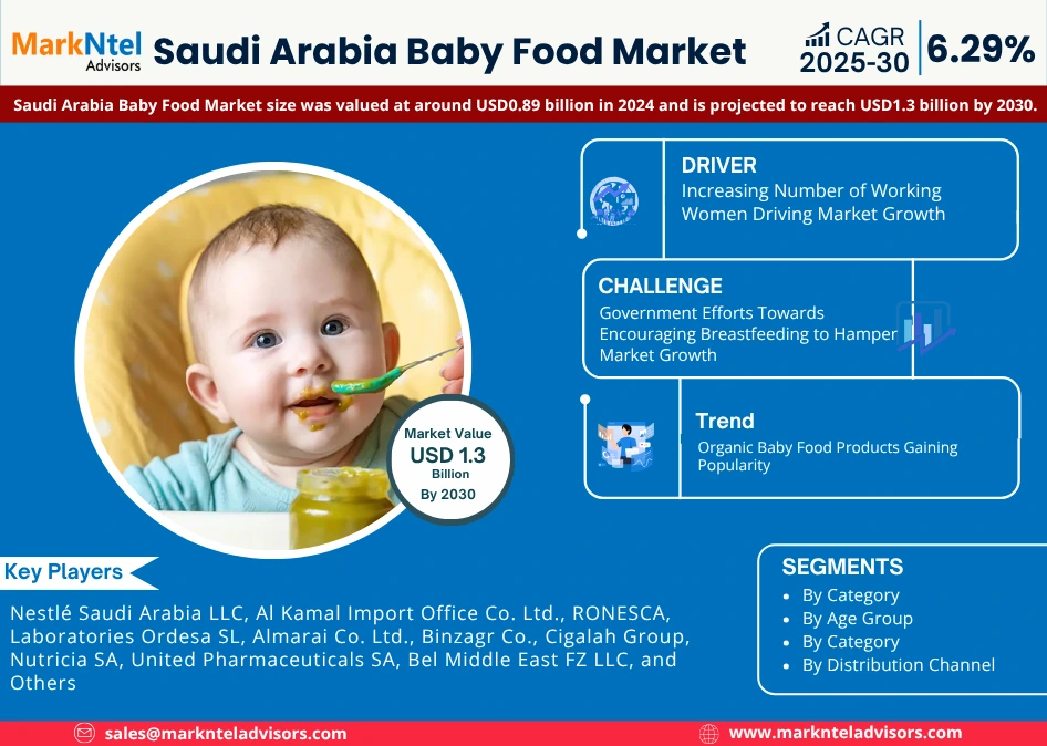 MarkNtel Advisors, a leading market research and consulting firm, has announced the release of its latest study titled Saudi Arabia Baby Food Market Research Report: Forecast (2025–2030). This report provides a detailed assessment of the Saudi Arabia Baby Food Market, covering its evolving dynamics, emerging trends, key growth drivers, major challenges, and competitive landscape.