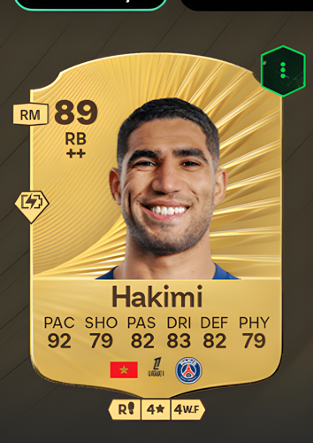 Achraf Hakimi’s Gold Rare card stands out as a top-tier Right Back with an impressive overall rating of 89, showcasing a remarkable blend of attributes that make him a formidable presence on the pitch. Boasting blistering pace at 92, solid dribbling at 83, and reliable passing at 82, Hakimi is perfectly equipped to surge up the flank and support both defensive and attacking plays. His defensive capabilities, rated at 82, combined with a respectable 79 in physicality, ensure he can hold his own against tough opponents. As a right back, Hakimi’s card offers the advantage of rapid transitions from defense to attack, allowing you to quickly break down the opposition’s lines and create decisive goal-scoring opportunities, making him an invaluable asset to any squad.