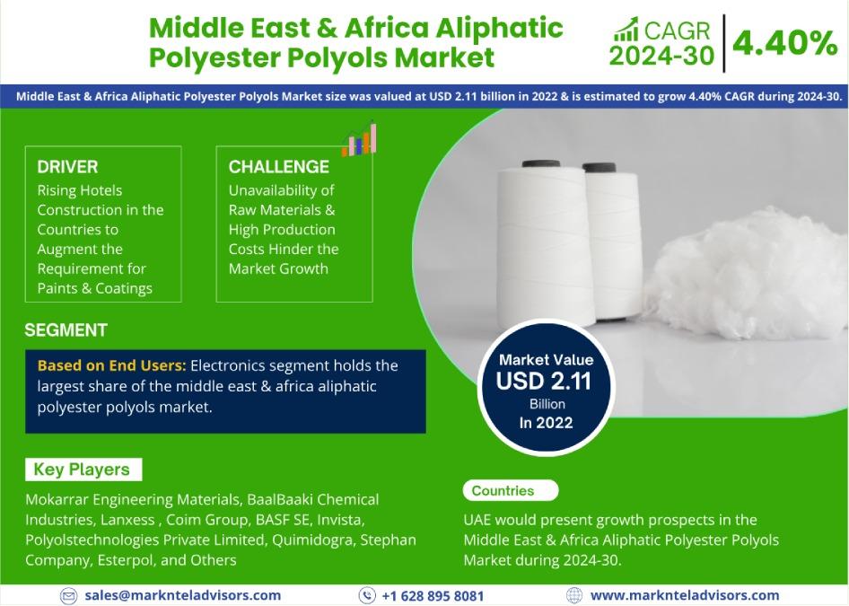 MarkNtel Advisors, a leading market research and consulting firm, has announced the release of its latest study titled Middle East & Africa Aliphatic Polyester Polyols Market Research Report: Forecast (2024-2030). This report provides a detailed assessment of the Middle East & Africa Aliphatic Polyester Polyols Market, covering its evolving dynamics, emerging trends, key growth drivers, major challenges, and competitive landscape.