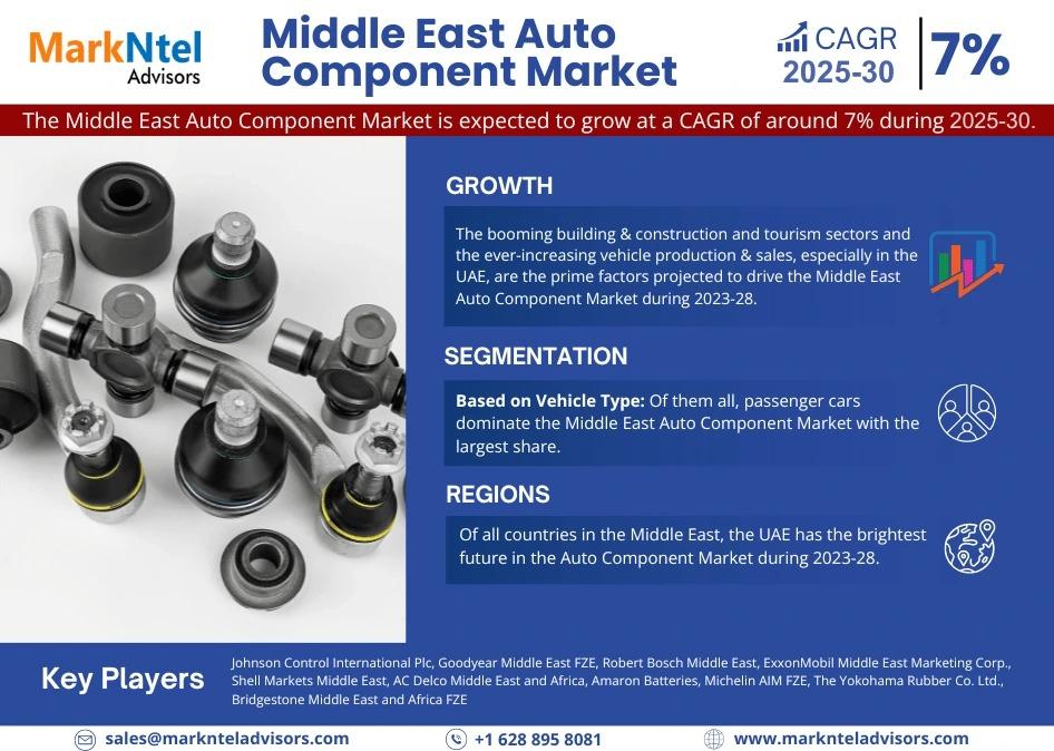 MarkNtel Advisors, a leading market research and consulting firm, has announced the release of its latest study titled Middle East Auto Component Market Research Report: Forecast (2025-2030). This report provides a detailed assessment of the Middle East Auto Component Market, covering its evolving dynamics, emerging trends, key growth drivers, major challenges, and competitive landscape.