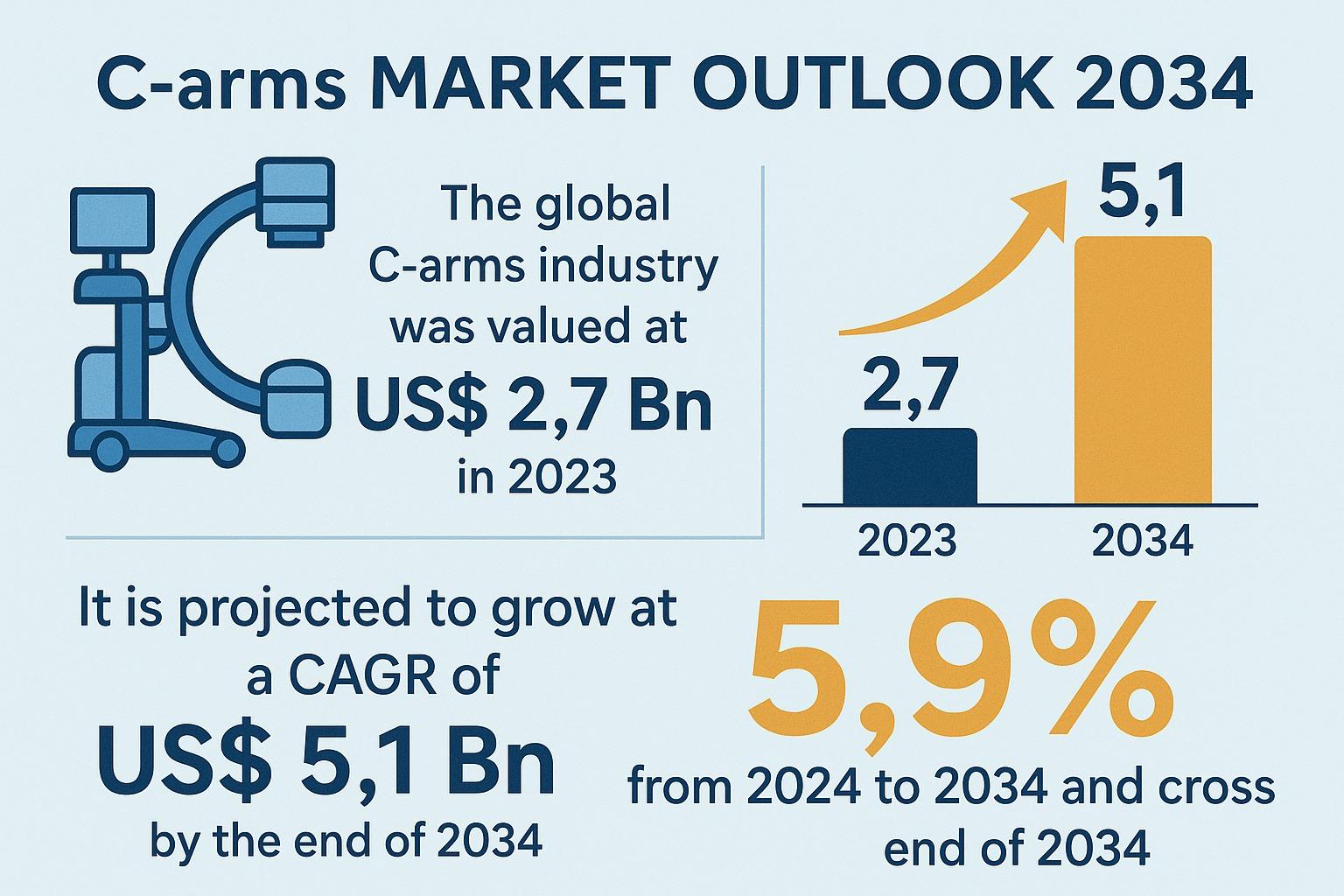 The global C-arms market is entering a decade of notable expansion, underpinned by rapid technological advancements, rising surgical volumes, and the growing prevalence of chronic diseases. Valued at US$ 2.7 Bn in 2023, the market is projected to grow steadily at a CAGR of 5.9% from 2024 to 2034, ultimately surpassing US$ 5.1 Bn by 2034. As healthcare systems worldwide invest heavily in modernization and advanced imaging solutions, C-arm devices have become indispensable tools across multiple clinical disciplines—from orthopedics and cardiology to neurosurgery and gastroenterology.