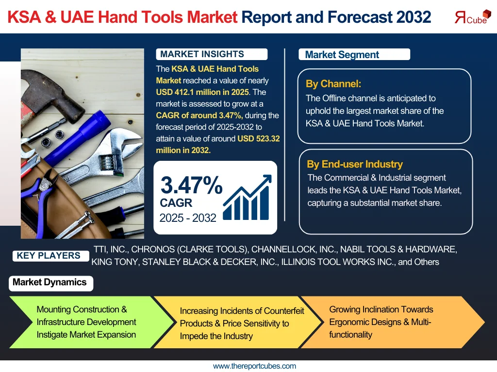 According to The Report Cube study the KSA & UAE Hand Tools Market reached a value of nearly USD 412.1 million in 2025. The market is assessed to grow at a CAGR of around 3.47%, during the forecast period of 2025-2032 to attain a value of around USD 523.32 million in 2032. The Hand Tools Industry in the Kingdom of Saudi Arabia & the UAE has been experiencing stable growth fuelled by strong construction sector progression, increasing manufacturing facilities, and rising DIY culture among residents. The infrastructure projects related to Saudi Vision 2030 & similar initiatives in the UAE have considerably enhanced demand for professional-grade hand tools across both nations.