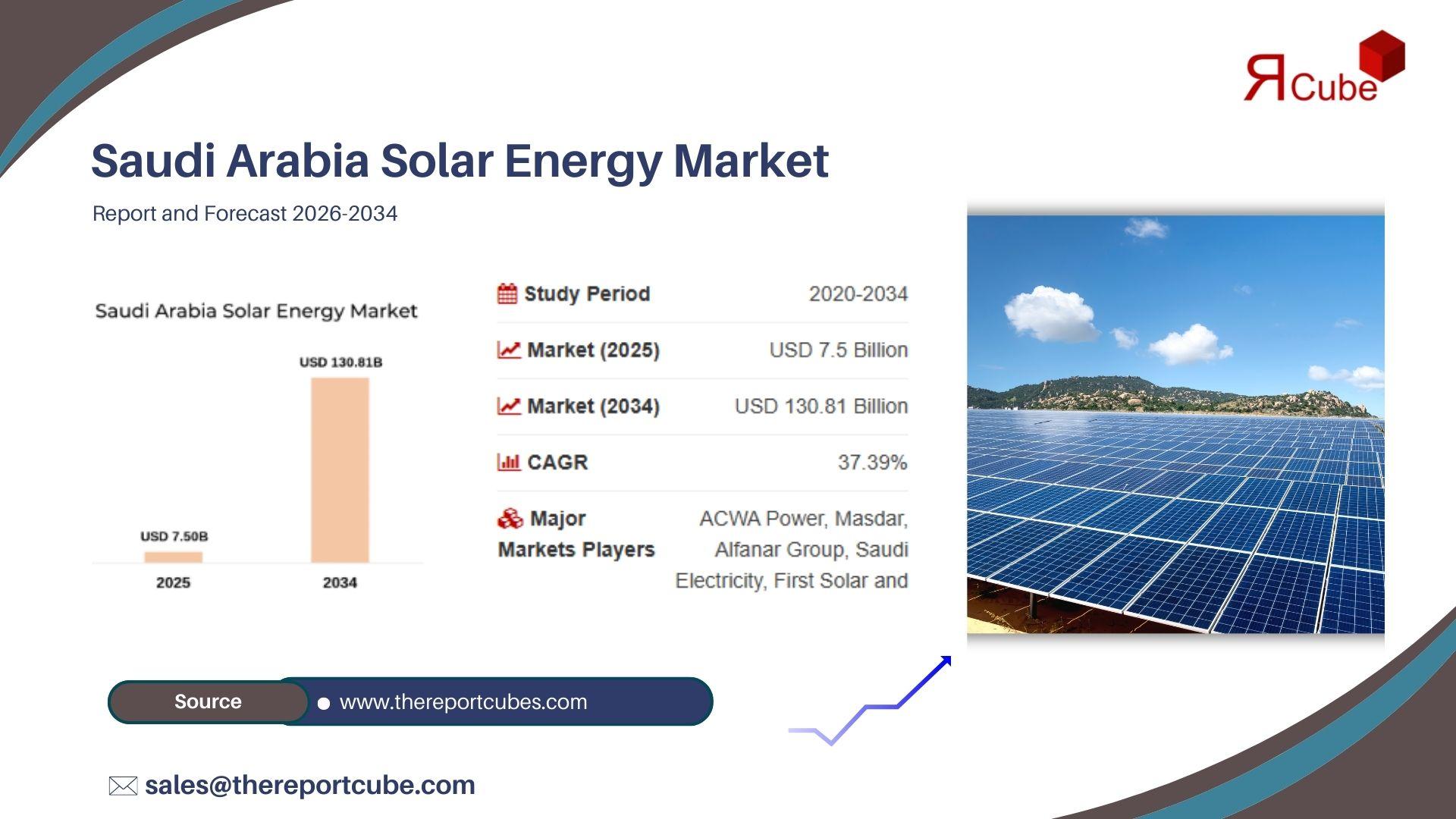 The Saudi Arabia Solar Energy Market is projected to reach USD 130.81 Billion by 2034, expanding at a compound annual growth rate (CAGR) of 37.39% during the forecast period 2026-2034. According to the latest industry analysis published by The Report Cube, the market was valued at USD 7.5 Billion in 2025.