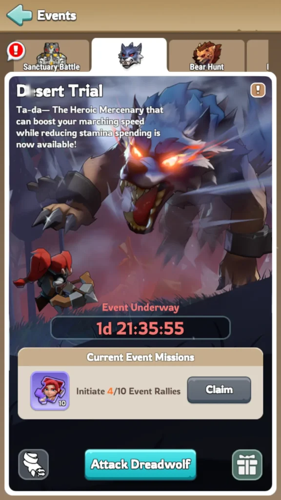 Join forces with your alliance by launching rallies against the Dreadwolf or support their efforts to earn Diana shards and progress toward unlocking her.