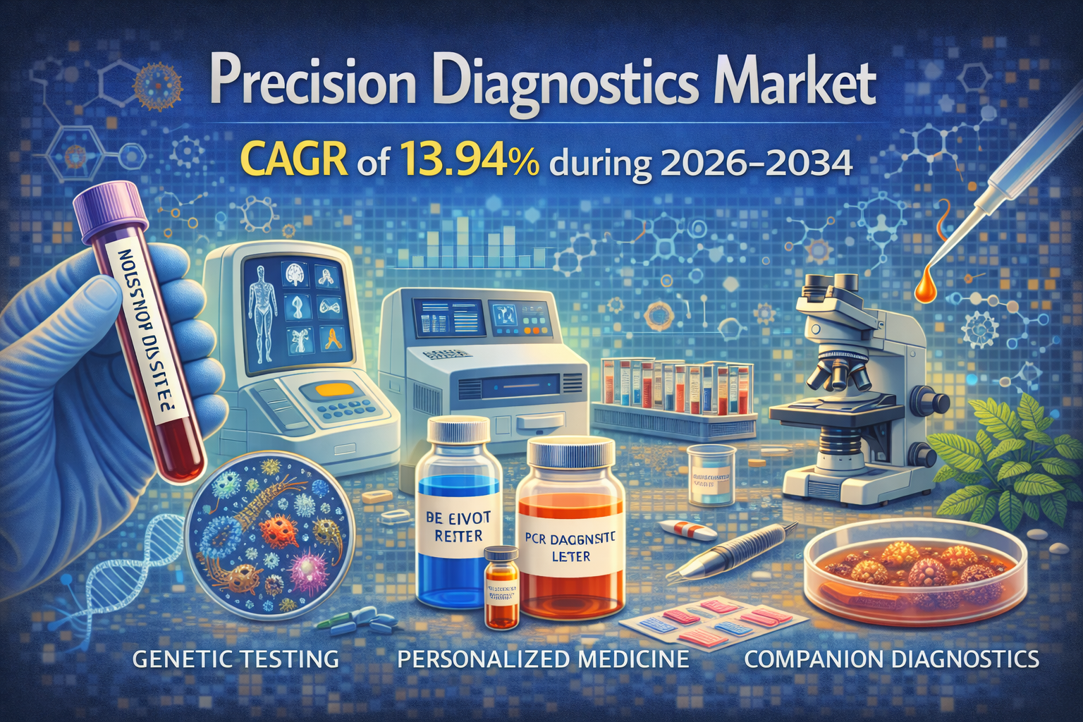 The Precision Diagnostics Market size is projected to reach US$ 381.80 billion by 2034, increasing from US$ 117.99 billion in 2025, reflecting a strong CAGR of 13.94% during 2026 to 2034. This significant expansion highlights the accelerating transition toward personalized medicine and biomarker driven clinical decision making. The growing integration of genomic technologies and advanced molecular testing platforms is transforming disease diagnosis, therapy selection, and patient monitoring across multiple therapeutic areas.