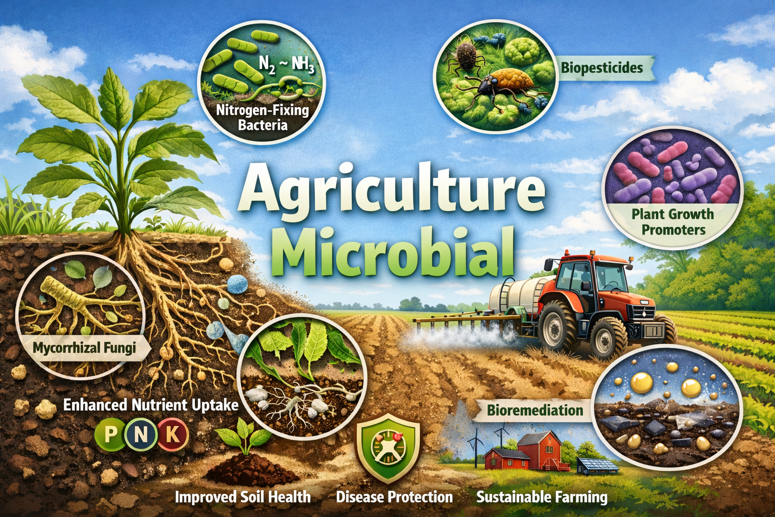 Agriculture microbial refers to beneficial microorganisms such as bacteria, fungi, and viruses used to improve crop productivity, soil fertility, and plant protection.