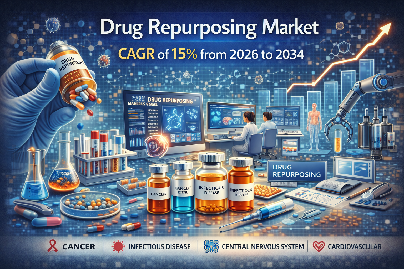 The Drug Repurposing Market is anticipated to expand at a CAGR of 15% from 2026 to 2034, reflecting strong growth momentum driven by technological innovation, rising chronic disease prevalence, and increasing healthcare expenditure. Market conditions continue to evolve, creating new strategic opportunities for pharmaceutical companies, research institutions, and healthcare providers. The overall landscape demonstrates stable progress and significant long term potential.