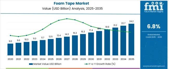 The Foam Tape Market is valued at USD 12.5 billion in 2025 and is projected to reach USD 24.2 billion by 2035, expanding at a CAGR of 6.8% over the forecast period. Growth is supported by rising demand for lightweight, high-performance bonding and sealing solutions across automotive, construction, electronics, and industrial manufacturing sectors. As industries shift toward cleaner aesthetics, vibration dampening, and faster assembly processes, foam tapes are increasingly replacing mechanical fasteners. Their ability to provide sealing, cushioning, insulation, and strong adhesion positions the Foam Tape Market as a critical enabler of modern manufacturing efficiency.