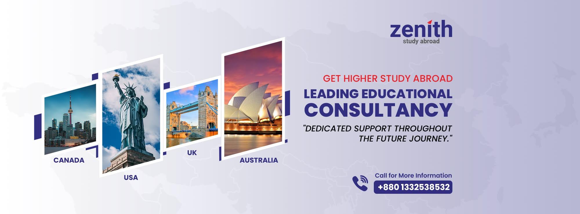 Zenith Study Abroad is a leading education consultancy firm in Dhaka, Bangladesh, specializes for higher studies in Canada, USA, UK, Australia and more. We provide seamless application support and assist with visa processing for a successful academic experience.